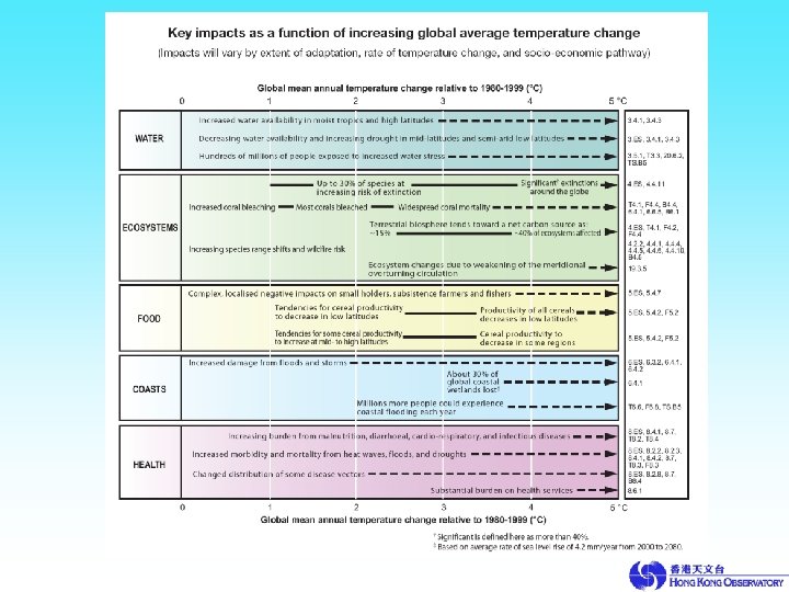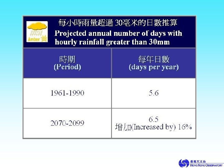 Climate Change in Hong Kong : Future Projections in the 21 st century Temperature : Downscaling based on IPCC’s Fourth Assessment Report (AR 4) Rainfall : Downscaling based on IPCC’s Third Assessment Report, being updated using AR 4 Sea level : The sea-level at the South China Sea including Hong Kong is likely to be close to the global average in the long run. According to IPCC AR 4, the global average sea-level will rise by 0. 18 to 0. 59 m at the end of 21 st century relative to the period 1980 to 1999.