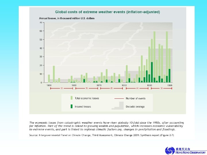 Weather and climate extremes Global warming leads to increase in occurrence of heat wave, drought and flooding events, and possibly the increase in tropical cyclone intensity of the Atlantic. Heat wave Tropical cyclone Drought ? ? ? (Source: US National Oceanic Atmospheric Administration) Flooding