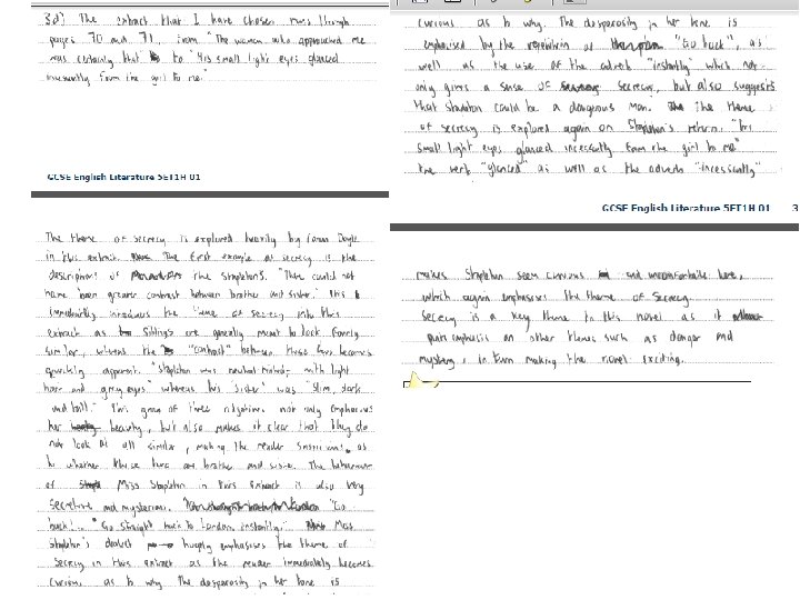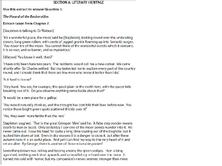 June 2013 QA: What do you learn about the character of Sir Henry? Key: 1) Highlight quotes directly about Sir Henry’s speech / actions. 2) Highlight quotes from other characters‘ speech / actions and Watson’s narrative which reveal Sir H’s Character. Can you make a structure point? Start/end/within/between paragraphs. QB: Explore how the writer uses language to present theme of fear. 1) Highlight individual words or phrases of no more than 4 words. 2) Annotate key words with language terms. Write up X 3 PEE paragraphs: The writer uses (lang) to present fear Fear is presented through the use of(lang)