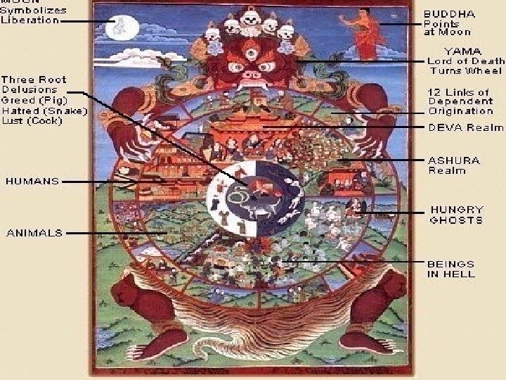 • Gods (pride ) Animals ( ignorance) • Asuras (jealousy) Hungry ghosts ( desire) • Humans (desire) Hell beings ( hatred)