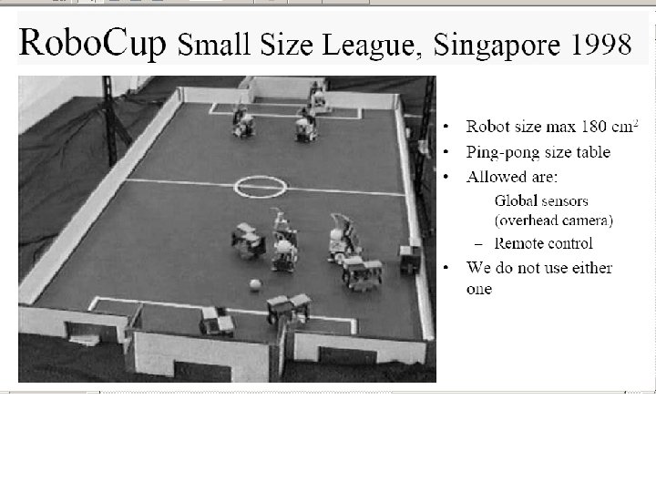3. 1 Robot Soccer “Robo. Cup is an international joint project to promote AI, robotics, and related fields. It is an attempt to foster AI and intelligent robotics research by providing a standard problem where a wide range of technologies can be integrated and examined. Robo. Cup chose to use the soccer game as a central topic of research, aiming at innovations to be applied for socially significant problems and industries. The ultimate goal of the Robo. Cup project is: By 2050, develop a team of fully autonomous humanoid robots that can win against the human world champion team in soccer. ” [Robo. Cup 1998]