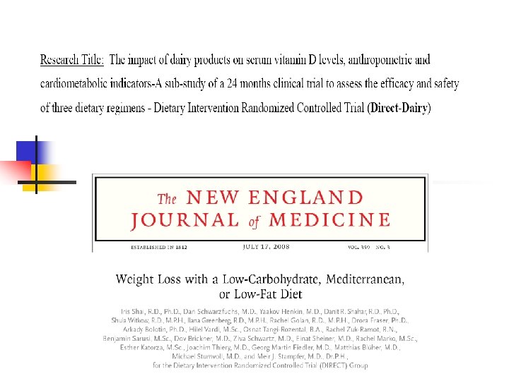 The Dietary Intervention Randomized Controlled Trial - DIRECT n=322 Low-fat diet Mediterranean diet Low-carb diet 2 years Evaluation Of dietary adherence In this two-year trial we randomized 322 moderately obese subjects (BMI=31 kg/m 2, age=52 years, 86% men) to one of three diets: low-fat restricted-calorie, Mediterranean restricted-calorie or low-carb non-restricted- calorie. weight parameters Metabolic & inflammatory biomarkers Diabetics