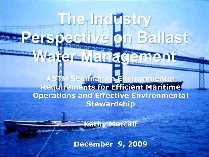 The Industry Perspective on Ballast Water Management ASTM Seminar on Environmental Requirements for Efficient Maritime Operations and Effective Environmental Stewardship Kathy Metcalf December 9, 2009