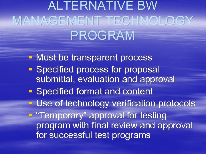 ALTERNATIVE BW MANAGEMENT TECHNOLOGY PROGRAM § Must be transparent process § Specified process for proposal submittal, evaluation and approval § Specified format and content § Use of technology verification protocols § “Temporary” approval for testing program with final review and approval for successful test programs