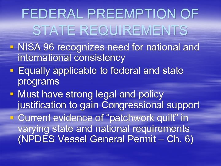 FEDERAL PREEMPTION OF STATE REQUIREMENTS § NISA 96 recognizes need for national and international consistency § Equally applicable to federal and state programs § Must have strong legal and policy justification to gain Congressional support § Current evidence of “patchwork quilt” in varying state and national requirements (NPDES Vessel General Permit – Ch. 6)