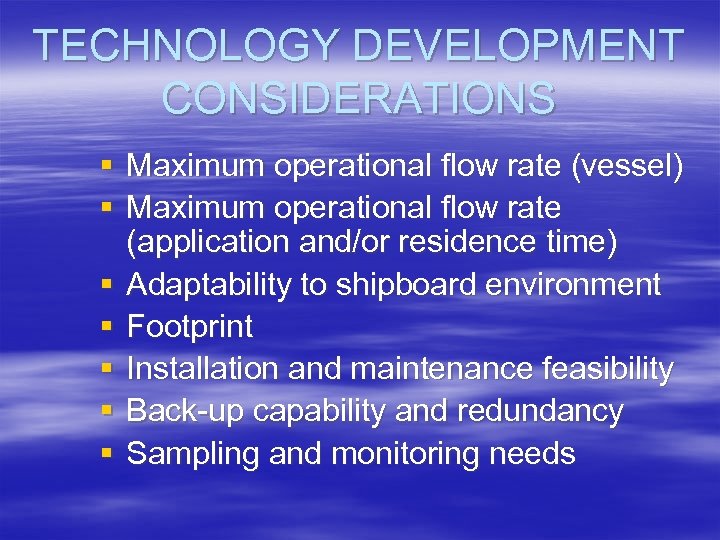TECHNOLOGY DEVELOPMENT CONSIDERATIONS § Maximum operational flow rate (vessel) § Maximum operational flow rate (application and/or residence time) § Adaptability to shipboard environment § Footprint § Installation and maintenance feasibility § Back-up capability and redundancy § Sampling and monitoring needs
