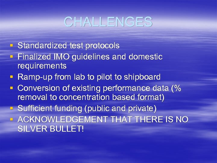 CHALLENGES § Standardized test protocols § Finalized IMO guidelines and domestic requirements § Ramp-up from lab to pilot to shipboard § Conversion of existing performance data (% removal to concentration based format) § Sufficient funding (public and private) § ACKNOWLEDGEMENT THAT THERE IS NO SILVER BULLET!