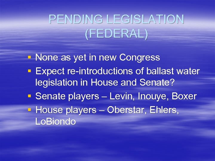 PENDING LEGISLATION (FEDERAL) § None as yet in new Congress § Expect re-introductions of ballast water legislation in House and Senate? § Senate players – Levin, Inouye, Boxer § House players – Oberstar, Ehlers, Lo. Biondo