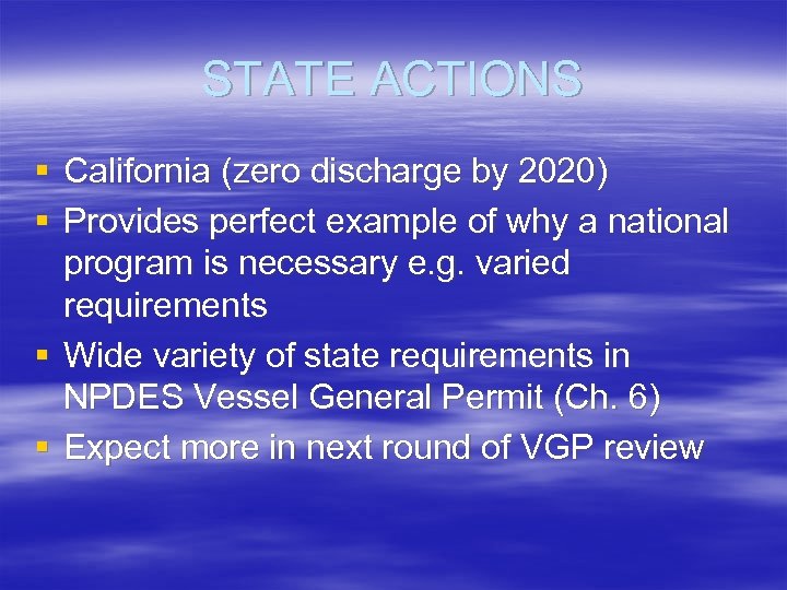 STATE ACTIONS § California (zero discharge by 2020) § Provides perfect example of why a national program is necessary e. g. varied requirements § Wide variety of state requirements in NPDES Vessel General Permit (Ch. 6) § Expect more in next round of VGP review