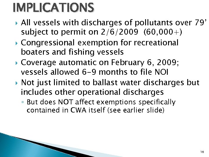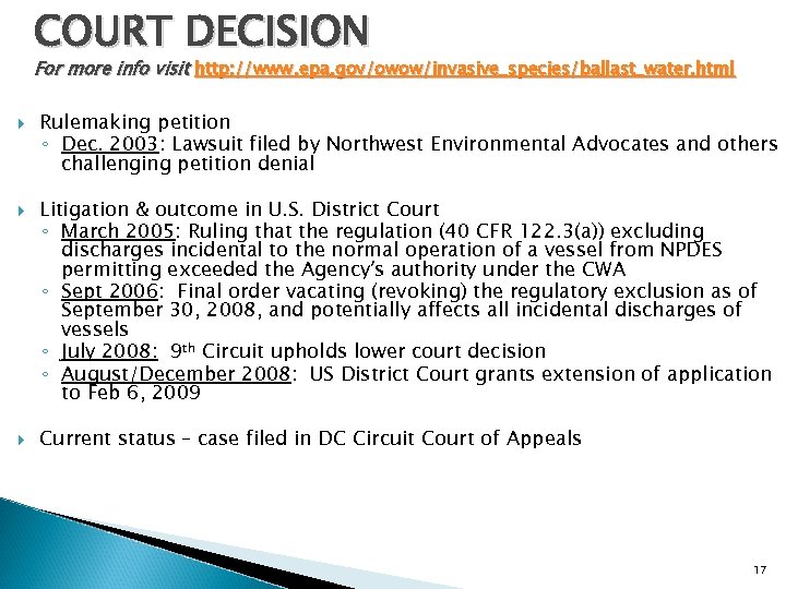 COURT DECISION For more info visit http: //www. epa. gov/owow/invasive_species/ballast_water. html Rulemaking petition ◦ Dec. 2003: Lawsuit filed by Northwest Environmental Advocates and others challenging petition denial Litigation & outcome in U. S. District Court ◦ March 2005: Ruling that the regulation (40 CFR 122. 3(a)) excluding discharges incidental to the normal operation of a vessel from NPDES permitting exceeded the Agency’s authority under the CWA ◦ Sept 2006: Final order vacating (revoking) the regulatory exclusion as of September 30, 2008, and potentially affects all incidental discharges of vessels ◦ July 2008: 9 th Circuit upholds lower court decision ◦ August/December 2008: US District Court grants extension of application to Feb 6, 2009 Current status – case filed in DC Circuit Court of Appeals 17