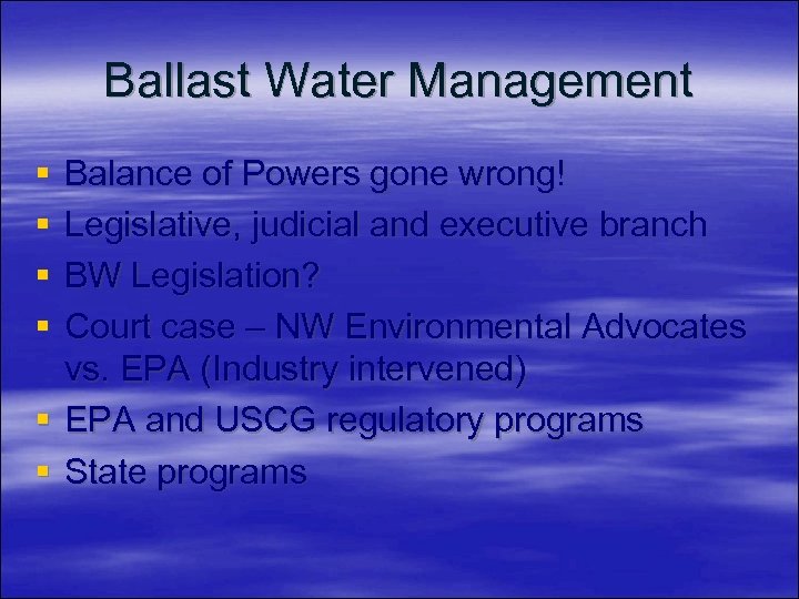 Ballast Water Management § § Balance of Powers gone wrong! Legislative, judicial and executive branch BW Legislation? Court case – NW Environmental Advocates vs. EPA (Industry intervened) § EPA and USCG regulatory programs § State programs