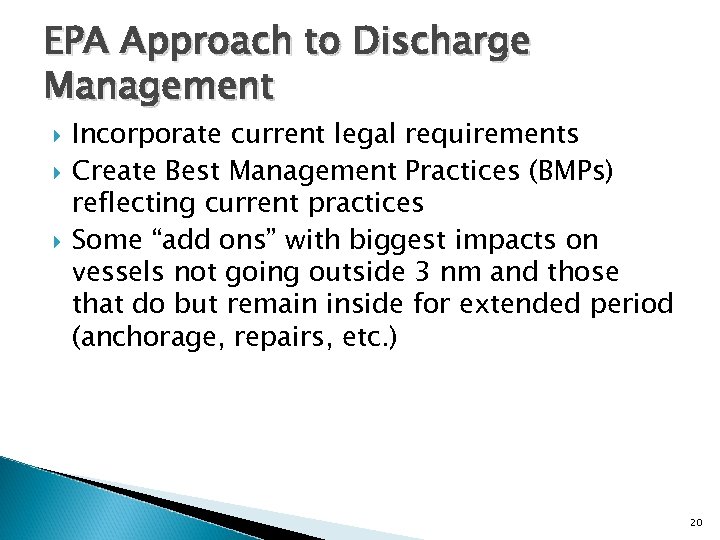 EPA Approach to Discharge Management Incorporate current legal requirements Create Best Management Practices (BMPs) reflecting current practices Some “add ons” with biggest impacts on vessels not going outside 3 nm and those that do but remain inside for extended period (anchorage, repairs, etc. ) 20