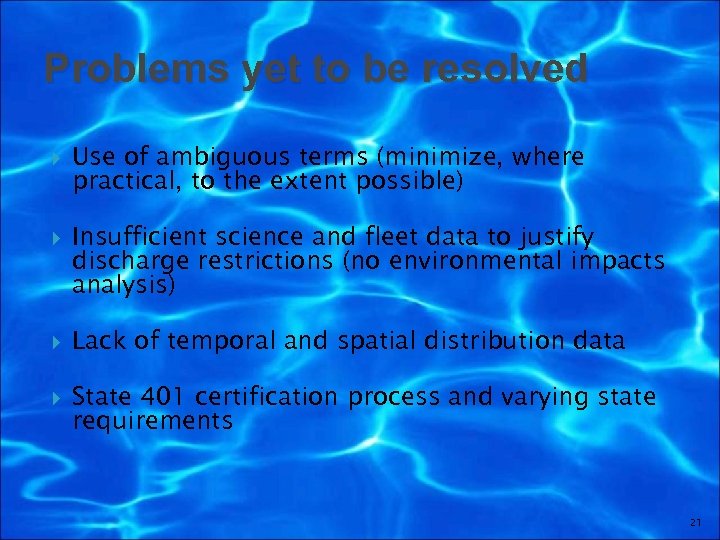 Problems yet to be resolved Use of ambiguous terms (minimize, where practical, to the extent possible) Insufficient science and fleet data to justify discharge restrictions (no environmental impacts analysis) Lack of temporal and spatial distribution data State 401 certification process and varying state requirements 21