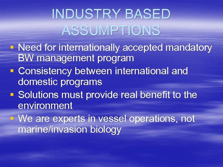INDUSTRY BASED ASSUMPTIONS § Need for internationally accepted mandatory BW management program § Consistency between international and domestic programs § Solutions must provide real benefit to the environment § We are experts in vessel operations, not marine/invasion biology