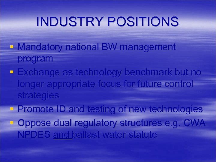 INDUSTRY POSITIONS § Mandatory national BW management program § Exchange as technology benchmark but no longer appropriate focus for future control strategies § Promote ID and testing of new technologies § Oppose dual regulatory structures e. g. CWA NPDES and ballast water statute