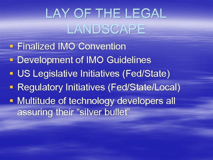 LAY OF THE LEGAL LANDSCAPE § § § Finalized IMO Convention Development of IMO Guidelines US Legislative Initiatives (Fed/State) Regulatory Initiatives (Fed/State/Local) Multitude of technology developers all assuring their “silver bullet”