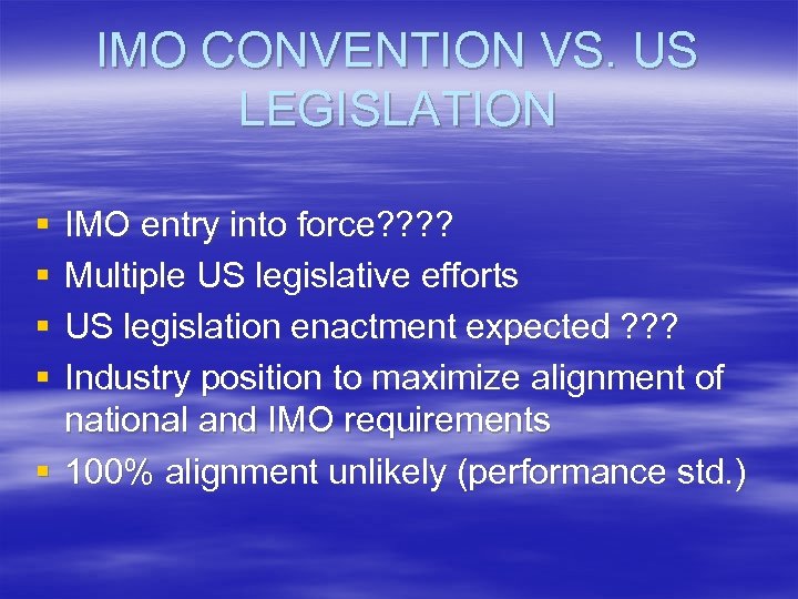 IMO CONVENTION VS. US LEGISLATION § § IMO entry into force? ? Multiple US legislative efforts US legislation enactment expected ? ? ? Industry position to maximize alignment of national and IMO requirements § 100% alignment unlikely (performance std. )
