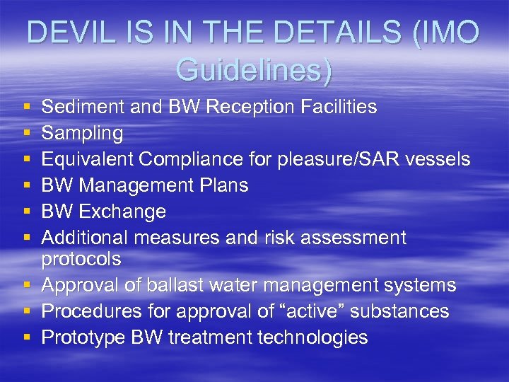 DEVIL IS IN THE DETAILS (IMO Guidelines) § § § Sediment and BW Reception Facilities Sampling Equivalent Compliance for pleasure/SAR vessels BW Management Plans BW Exchange Additional measures and risk assessment protocols § Approval of ballast water management systems § Procedures for approval of “active” substances § Prototype BW treatment technologies