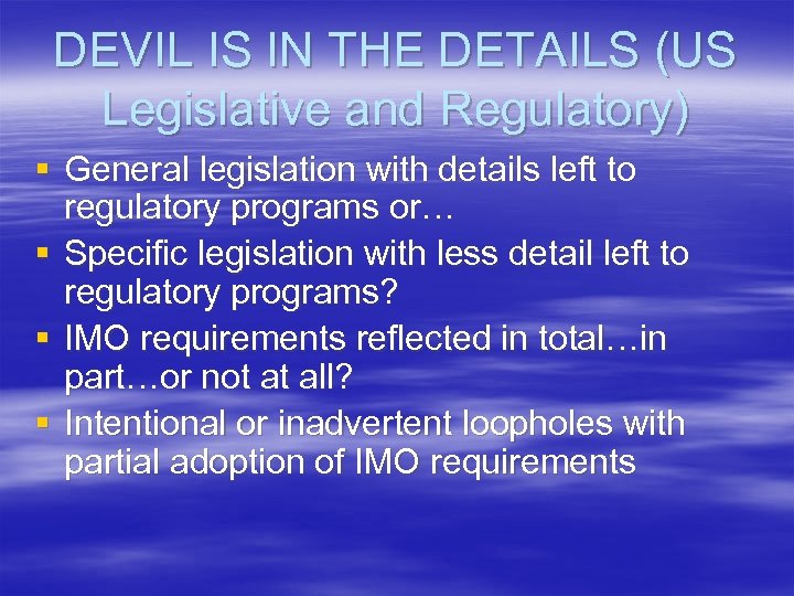 DEVIL IS IN THE DETAILS (US Legislative and Regulatory) § General legislation with details left to regulatory programs or… § Specific legislation with less detail left to regulatory programs? § IMO requirements reflected in total…in part…or not at all? § Intentional or inadvertent loopholes with partial adoption of IMO requirements