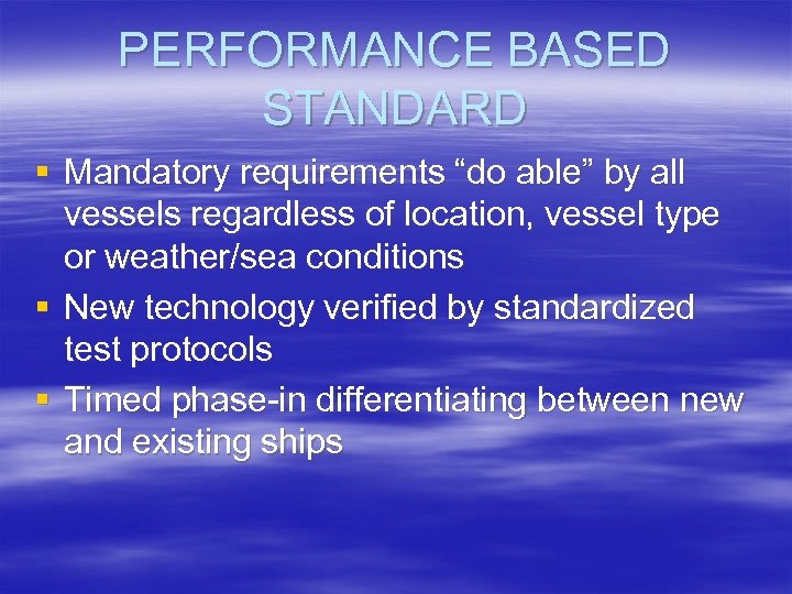 PERFORMANCE BASED STANDARD § Mandatory requirements “do able” by all vessels regardless of location, vessel type or weather/sea conditions § New technology verified by standardized test protocols § Timed phase-in differentiating between new and existing ships