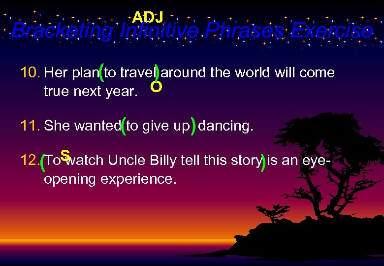 ADJ Bracketing Infinitive Phrases Exercise 10. Her plan(to travel)around the world will come true next year. O 11. She wanted(to give up) dancing. 12. (To. S watch Uncle Billy tell this story is an eye) opening experience.
