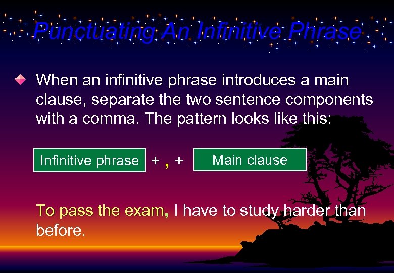 Punctuating An Infinitive Phrase When an infinitive phrase introduces a main clause, separate the two sentence components with a comma. The pattern looks like this: Infinitive phrase + , + Main clause To pass the exam, I have to study harder than before.