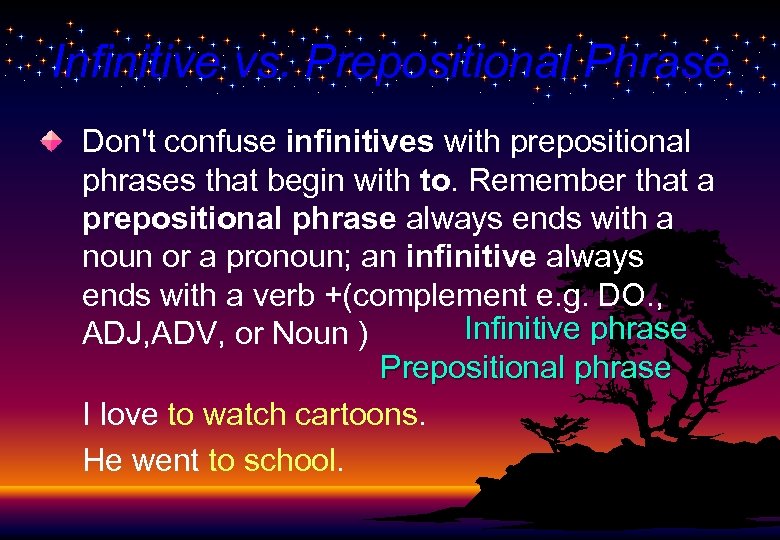 Infinitive vs. Prepositional Phrase Don't confuse infinitives with prepositional phrases that begin with to. Remember that a prepositional phrase always ends with a noun or a pronoun; an infinitive always ends with a verb +(complement e. g. DO. , Infinitive phrase ADJ, ADV, or Noun ) Prepositional phrase I love to watch cartoons. He went to school.