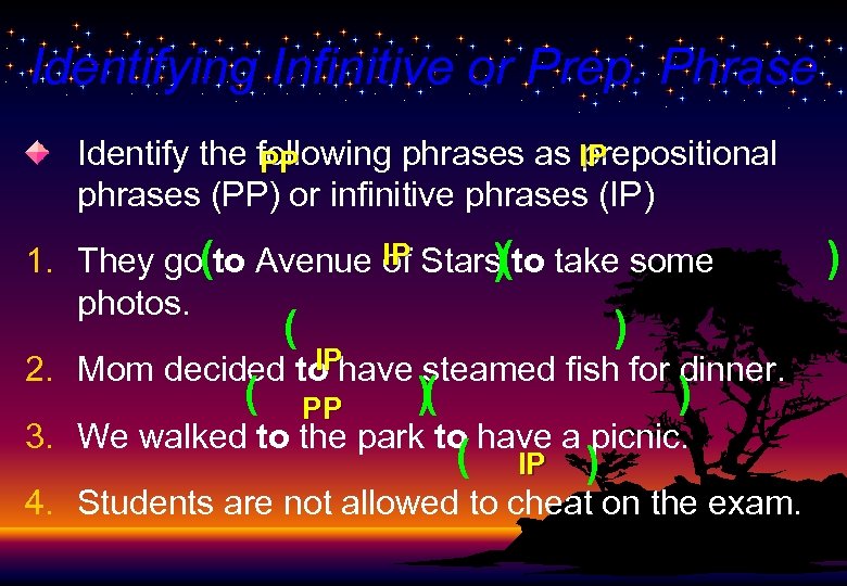 Identifying Infinitive or Prep. Phrase Identify the following phrases as IP prepositional PP phrases (PP) or infinitive phrases (IP) 1. They go(to Avenue IP Stars(to take some of ) photos. ( ) IP 2. Mom decided to have steamed fish for dinner. ( PP )( ) 3. We walked to the park to have a picnic. ( IP ) 4. Students are not allowed to cheat on the exam. )