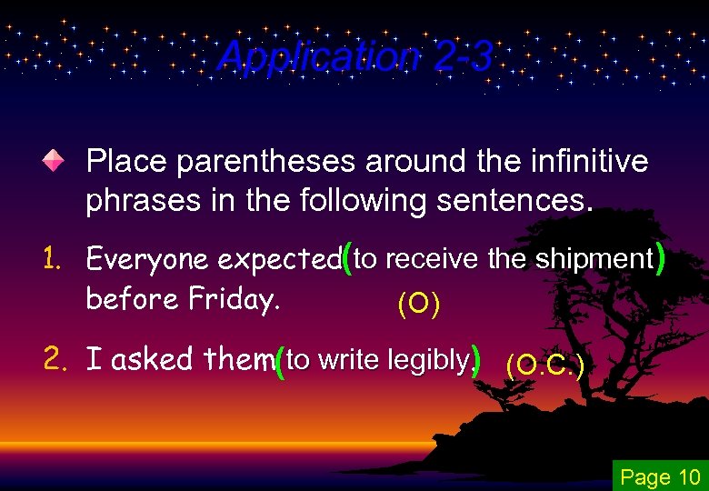 Application 2 -3 Place parentheses around the infinitive phrases in the following sentences. 1. Everyone expected(to receive the shipment ) before Friday. (O) 2. I asked them(to write legibly) (O. C. ). Page 10