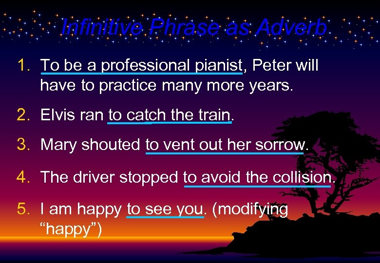 Infinitive Phrase as Adverb 1. To be a professional pianist, Peter will have to practice many more years. 2. Elvis ran to catch the train. 3. Mary shouted to vent out her sorrow. 4. The driver stopped to avoid the collision. 5. I am happy to see you. (modifying “happy”)