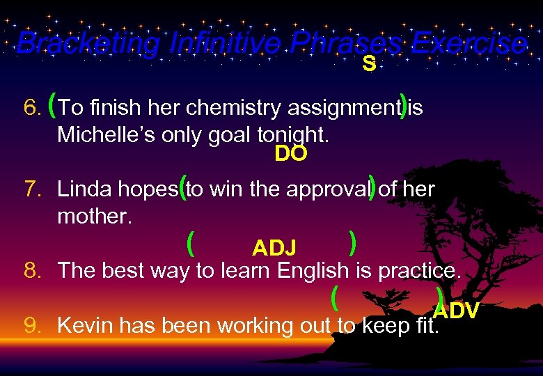 Bracketing Infinitive Phrases Exercise S 6. (To finish her chemistry assignment)is Michelle’s only goal tonight. DO 7. Linda hopes(to win the approval) of her mother. ) ( ADJ 8. The best way to learn English is practice. ( ) ADV 9. Kevin has been working out to keep fit.