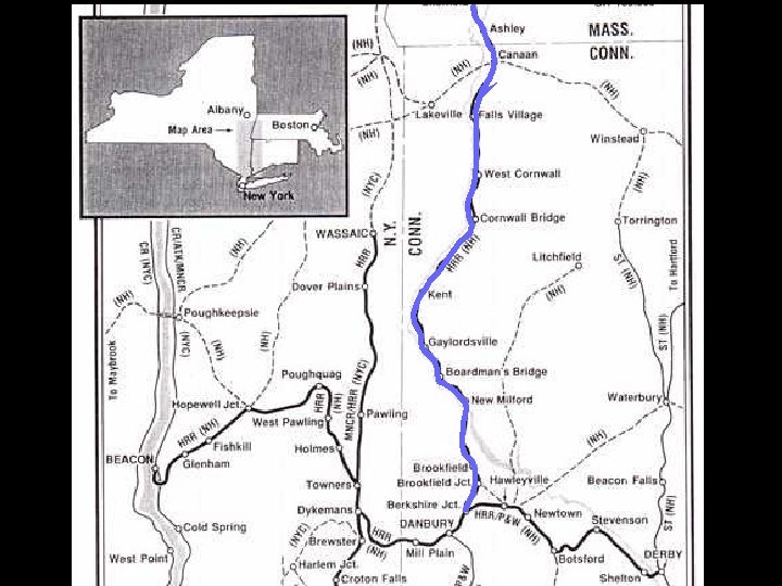 Housatonic RR completed 1841 By February 1840 rails stretched from Bridgeport, CT to New Milford, CT. In December of 1841, rails reached to Canaan, CT. Ten years later, the railroad had reached into Massachusetts and had forged links with the Western Railroad of Massachusetts. Major freight commodities on the Housatonic in this period were lime & limestone, marble, iron railcar wheels, coal, tobacco and tools, as well as many agricultural products. And it carried another very important product -- milk…the Housatonic RR was the very first run a scheduled milk train.