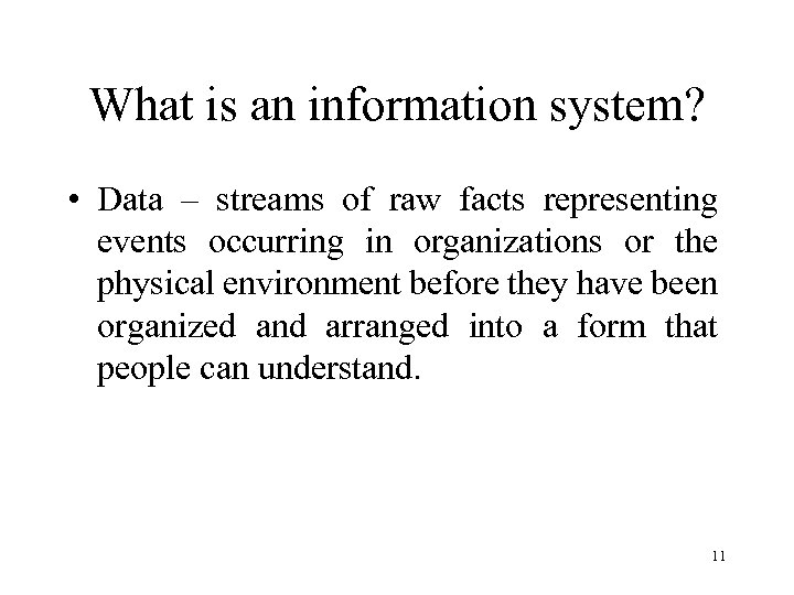What is an information system? • An interrelated components working together to collect, process, store, and disseminate information to support decision making, coordination, control, analysis, and visualization in an organization. • Information – data that have been shaped into a form that is meaningful and useful to human beings. 10