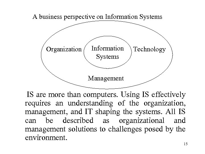 A business perspective on Information Systems Organization Information Systems Technology Management IS are more than computers. Using IS effectively requires an understanding of the organization, management, and IT shaping the systems. All IS can be described as organizational and management solutions to challenges posed by the environment. 15