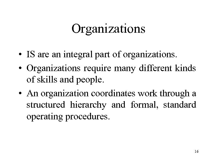 Organizations • IS are an integral part of organizations. • Organizations require many different kinds of skills and people. • An organization coordinates work through a structured hierarchy and formal, standard operating procedures. 16