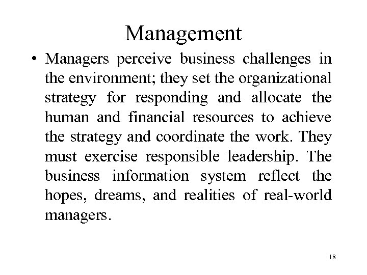 Management • Managers perceive business challenges in the environment; they set the organizational strategy for responding and allocate the human and financial resources to achieve the strategy and coordinate the work. They must exercise responsible leadership. The business information system reflect the hopes, dreams, and realities of real-world managers. 18