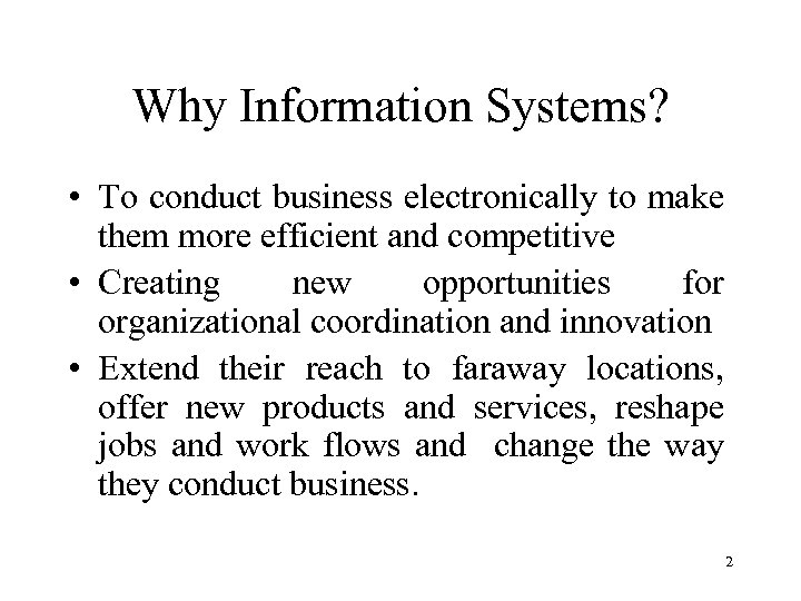 Why Information Systems? • To conduct business electronically to make them more efficient and competitive • Creating new opportunities for organizational coordination and innovation • Extend their reach to faraway locations, offer new products and services, reshape jobs and work flows and change the way they conduct business. 2