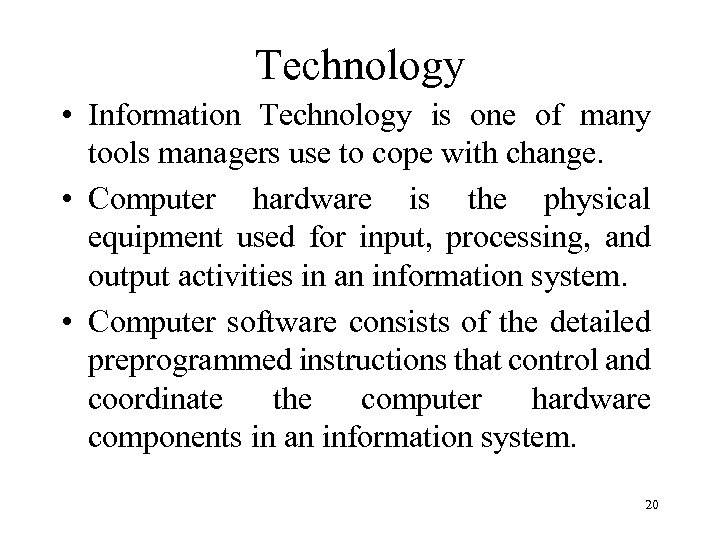 Technology • Information Technology is one of many tools managers use to cope with change. • Computer hardware is the physical equipment used for input, processing, and output activities in an information system. • Computer software consists of the detailed preprogrammed instructions that control and coordinate the computer hardware components in an information system. 20