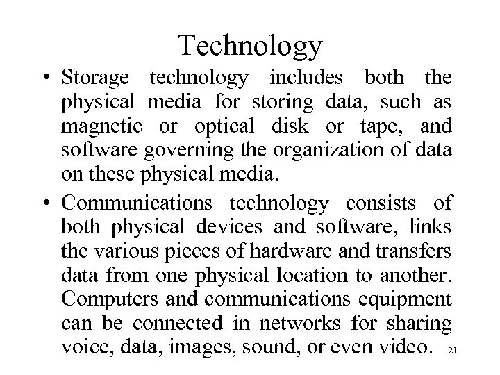 Technology • Storage technology includes both the physical media for storing data, such as magnetic or optical disk or tape, and software governing the organization of data on these physical media. • Communications technology consists of both physical devices and software, links the various pieces of hardware and transfers data from one physical location to another. Computers and communications equipment can be connected in networks for sharing voice, data, images, sound, or even video. 21