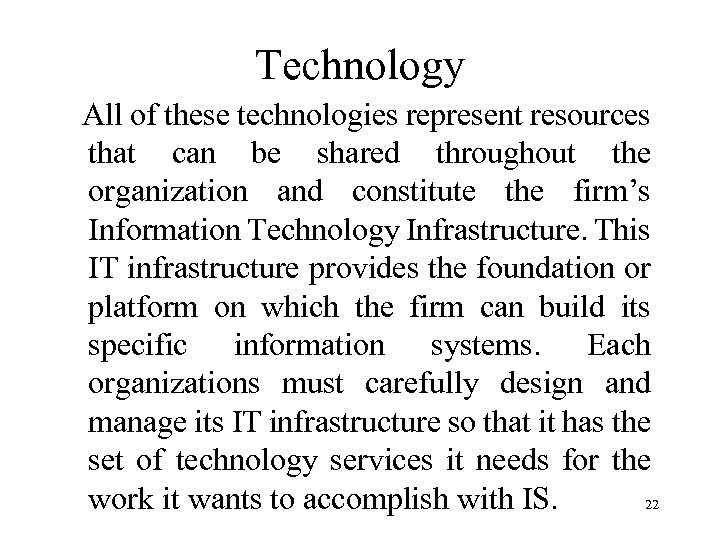 Technology All of these technologies represent resources that can be shared throughout the organization and constitute the firm’s Information Technology Infrastructure. This IT infrastructure provides the foundation or platform on which the firm can build its specific information systems. Each organizations must carefully design and manage its IT infrastructure so that it has the set of technology services it needs for the work it wants to accomplish with IS. 22