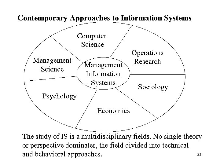Contemporary Approaches to Information Systems Computer Science Management Information Systems Operations Research Sociology Psychology Economics The study of IS is a multidisciplinary fields. No single theory or perspective dominates, the field divided into technical 23 and behavioral approaches.