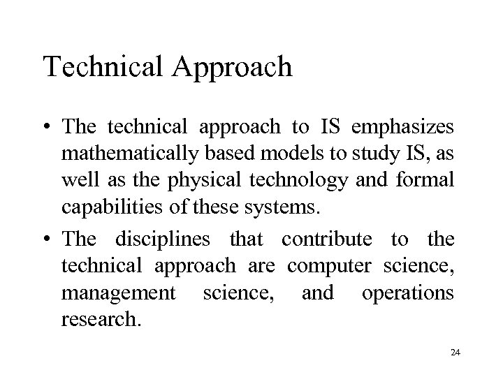 Technical Approach • The technical approach to IS emphasizes mathematically based models to study IS, as well as the physical technology and formal capabilities of these systems. • The disciplines that contribute to the technical approach are computer science, management science, and operations research. 24