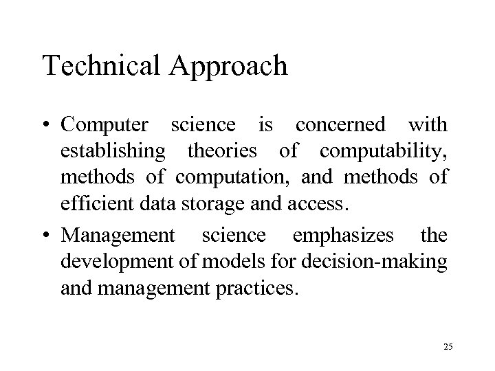 Technical Approach • Computer science is concerned with establishing theories of computability, methods of computation, and methods of efficient data storage and access. • Management science emphasizes the development of models for decision-making and management practices. 25