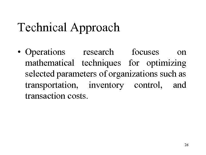 Technical Approach • Operations research focuses on mathematical techniques for optimizing selected parameters of organizations such as transportation, inventory control, and transaction costs. 26