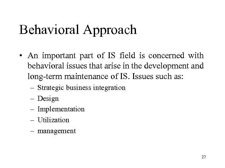 Behavioral Approach • An important part of IS field is concerned with behavioral issues that arise in the development and long-term maintenance of IS. Issues such as: – – – Strategic business integration Design Implementation Utilization management 27
