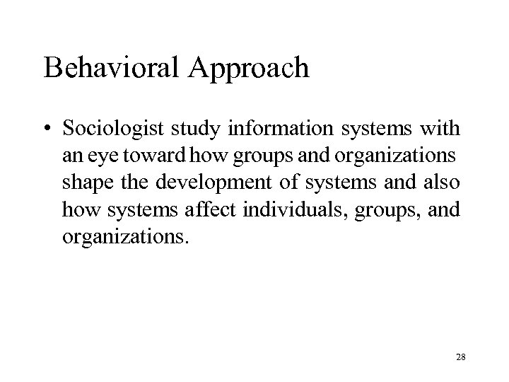 Behavioral Approach • Sociologist study information systems with an eye toward how groups and organizations shape the development of systems and also how systems affect individuals, groups, and organizations. 28