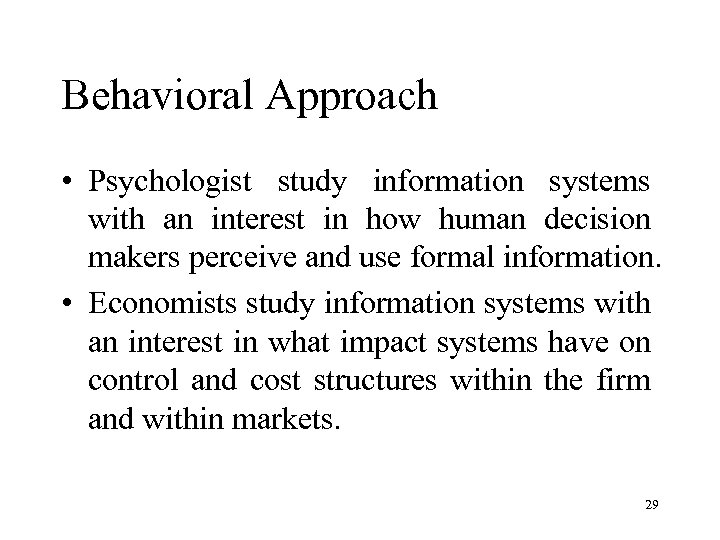 Behavioral Approach • Psychologist study information systems with an interest in how human decision makers perceive and use formal information. • Economists study information systems with an interest in what impact systems have on control and cost structures within the firm and within markets. 29