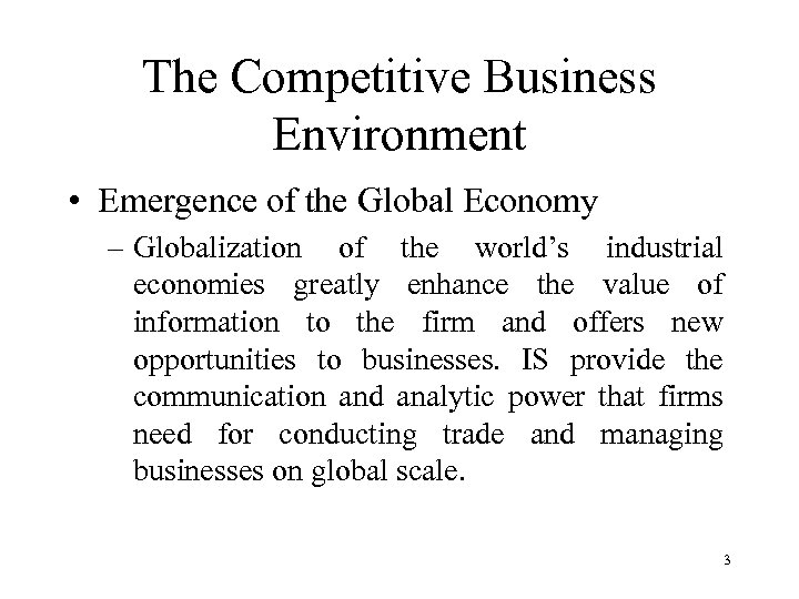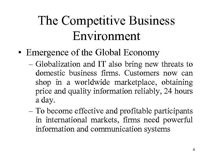 The Competitive Business Environment • Emergence of the Global Economy – Globalization of the world’s industrial economies greatly enhance the value of information to the firm and offers new opportunities to businesses. IS provide the communication and analytic power that firms need for conducting trade and managing businesses on global scale. 3