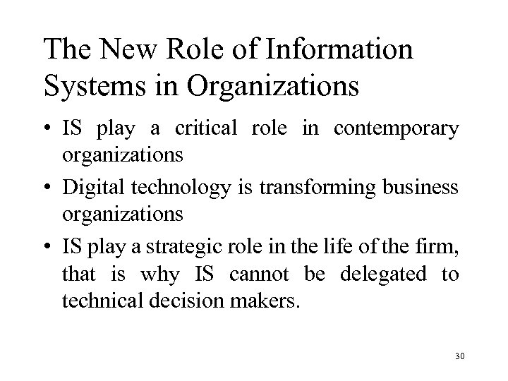 The New Role of Information Systems in Organizations • IS play a critical role in contemporary organizations • Digital technology is transforming business organizations • IS play a strategic role in the life of the firm, that is why IS cannot be delegated to technical decision makers. 30