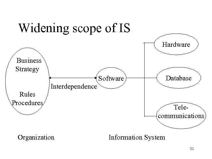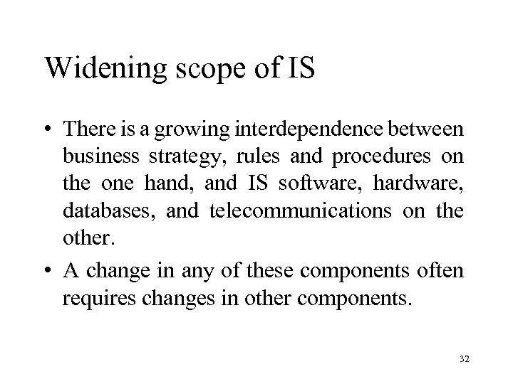 Widening scope of IS Hardware Business Strategy Database Software Interdependence Rules Procedures Organization Telecommunications Information System 31